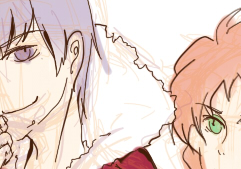 遅刻もいいところですが、お誕生日おめでとう!臣! そして同時進行で企画してた「会計室」、ついにお披露目することができました…!わーい! って私、絵版借りるくらいしか貢献できてないのですが(!)、Rikoさんのお陰でものすごくセレブリティなお部屋が出来上がりました…!紫でちょっと色っぽいお・部・屋v 笑 会計のどちらかでも大好き!という方は、是非遊びに来ていただけるとうれしいですvv リンクもご自由にはっていただいてOK!ですので…! みんなで会計スキーの輪を広めていきましょうvvv 楽しみ! んで、その次になにをしているかと申しますと…… 現在サイト改装に勤しんでます。 今回は久し振りにTOP絵でもつけようかと思いまして… 今までイラストサイトなの忘れるくらい絵とかないTOPでしたからねー(´∀`*) 素材やさんに頼りまくり!笑(だって素材眺めてるの好きなんだもの…!) 今回は、何だか非常にくだけた感じのサイトになりそうです。 こっちものそのそがん ば ろ う …! 「ちもり」 …じゃないよ、「とももり」だよ!※サムネクリックで無駄にでかい画像出ます(*´д`*) 別部屋の方でなのですが、Rikoさんよりバトンを頂きましたので、頑張って描いてみました。知盛!ち・も! 銀髪描くの大好きなのですんごい楽しかった…!ウフフv ちなみに十六夜記の服装なのはただの趣味です。 …そんなこんなで、バトンいっきまーす! (´∀`*) 【お絵描きバトン 】 ※回された人は回してくれた人の指示に従うこと。 ※指示に従って描かれた絵は必ず日記に載せること。 ※回す時は回すキャラと指示を選んで回すこと。 ※必ず指示選択欄に指示を足してから回す。 指示選択欄 [猫耳・眼帯・血・帽子・眼鏡・制服・花・リボン・お菓子・悲しみ ハート・サスペンダー・ネクタイ・音符・うさ耳・スーツ・手袋・首輪 目隠し・薔薇・鎖 水着・王冠・白衣・涙・イングリッシュ系・毛・ニーソックス ドS・ドレス・Vネック・サラリーマン・包帯・髪留め・刀・いちご・ショタ・うるんだ瞳・着物・メイド服v] キャラ:知盛(遙か3) 指定:刀 ■あなたの名前と使用した画材は? >改めまして…ちびっ子です。 画材はいつものとおりSAI使ってます。 ■この絵でこだわった所は? >こだわった…というかがんばったのは中に着てるTシャツ(違うだろ!)の柄! 細かい作業が苦手なのでヒーヒー言いながら頑張りました。愛の力で!笑 ■回してくれた人の絵はどう思う? >とっても丁寧で美しい絵だなあと思います。もう見るたびヨダレでます。(汚!) Rikoさんの描かれるひとたちの、柔らか~い雰囲気がとっても好きです。 ■描き終えての感想を述べて下さい >…っていうかお題「刀」なのに刀がすっかり脇役になっちゃいましたね!ヒィーΣ(´д`ノ)ノ すっすみません!今度リベンジします!! ……とりあえず二刀流ってことが伝わ れ ば … ! ■この人の絵がみたい思う人7人にキャラと指示を指定して下さい >うぬぬぅー 回したい方は沢山いらっしゃるのですが…今回はあえてのアンカーで!ごめんなさい… 誰か拾いたいお方がいらっしゃいましたら是非是非もっていってやってください!ワタクシ泣いて喜びます…! お題も密かに追加しておきましたので!笑 …お絵かきとても楽しかったです^^* Rikoさん、素敵なバトンをほんとうにありがとうございました! --------------------------------------------- …で、そんな遙か3ですが、今は密かに十六夜記を始めました。 まだ「運命の迷宮」(現代編のアレ)も終わってないのに…! 笑 でもゲームの順番的には十六夜の方が先なので、現代編はこっち終わってから改めてやろうかと思ってます。ちもにも会えるようになる事だしね!(´∀`*)ウフフ どっちもまだ殆ど自分でやれてないんですが、時間見つけてのそのそ頑張りたいと思います… 以下、中途半端になってた本編の感想! ↓ 続きを読む 続・おみたん本当に進行スローペース過ぎて、今やっと下塗りまでできたところ… 進行率20%くらい?でしょうか。 でもここまでくればあとは大好きな色塗り!愛のチカラで頑張りたいです~ もう10月入っちゃったけど(絶望した!) …まってて!おみみん! …来月はメガネ帝王(笑)の誕生日ですね^^ 郁たんの誕生日を祝ったのがまだこの間のことのような気がしているのですが、ほんとに、一年早いですね… そういえば、私がヘヴンにどんはまりしたのは丁度去年の今頃でした。わーい1周年だ! サイト一周年にはまだまだ早いですが、なんだかうきうきしてしまいます。ありがとうヘヴン!これからもよろしくヘヴン!笑 原点に立ち返って、これからも頑張りますー^^ 以下、お返事ですvvありがとうございました! 続きを読む 亀の歩みですおみたんの絵!只今進行率8%くらい… 先は長いぜ! 下書きはできたので、あとはちまっちまっと主線描いて色塗りして頑張ります。 主線を(一応)描くようになったのが私の最近の進歩…だと思う。 っていうか今までどうやって絵を描いてたんだ私(笑) こないだ言ってたはるときは遂に全クリしましたよー!いやー面白かった^^