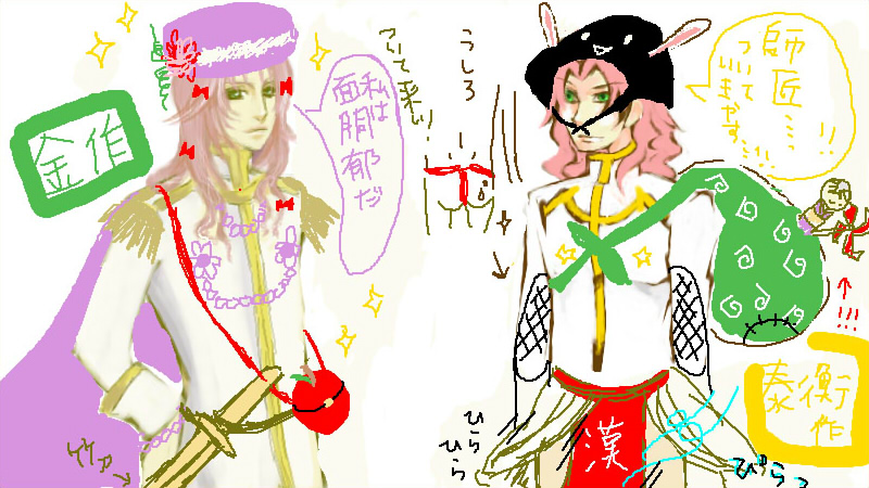 ……高校ん時の国語便覧引っぱり出してきました。笑! 何故か私は、昔っから困ると便覧に頼っている気がするんですが… でもあれ予想外に役に立つんですよ!!!ホントに! 昔の人の衣装は…思ったとおり、資料が充実していました。(´∀`*) 服の各部の名称とか、衣の合わせ方とか、凄く楽しかった!!あと身分による服の違いとか… 改めて遙かキャラの服と比べてみて、もんの凄く感動しましたよ!!細かいところまでホントよく作られてるね…!。・゚・(ノ∀`)・゚・。 あとおもしろかったのは文学史!この辺はさすが国語便覧(笑)ですが、当時の書物から分かる歴史をいいとこ取りで説明してくれてるので、日本史さっぱりな私でもよく分かりました。平家家系図にときめいた…vv 当時あの時代に生きてた人、みんな義経びいきでわらっちゃったよ!!さすが九郎…! そして便覧はなぜか敦盛率高かった…ような気がします。笑 絵もしっかり載ってるし、あと、馬の毛並み!あっつんの馬だけなんか格好良くて…!!何あれ!!! …あっつんの意外な男らしさにドキドキしました。 …便覧、ありがとう!!! ---------------------------------- …ちょっと私の中で盛り上がってしまったので……… またアレなもの置いていきます…… 連続でスミマセ………orz お嫌いじゃなければどうぞ。 お前ーー! そんなとこが好いんじゃないかと……先日の絵茶会に来てくださった皆様、本当に本当にありがとうございました!! 今年のヒデたんは、とっても忘れられない日になりそうです。 。・゚・(ノ∀`)・゚・。 描いちゃった…ヒノエコスは美脚じゃないと難しそうだ朝起きたら「いいもの見せてあげる☆」といもーとに呼ばれました。 ちもっこーー絵茶練習して描いたチモ。 なんか幼くなったぞ…! 絵茶練中です…昨日はちょっと絵茶練習しておりました。